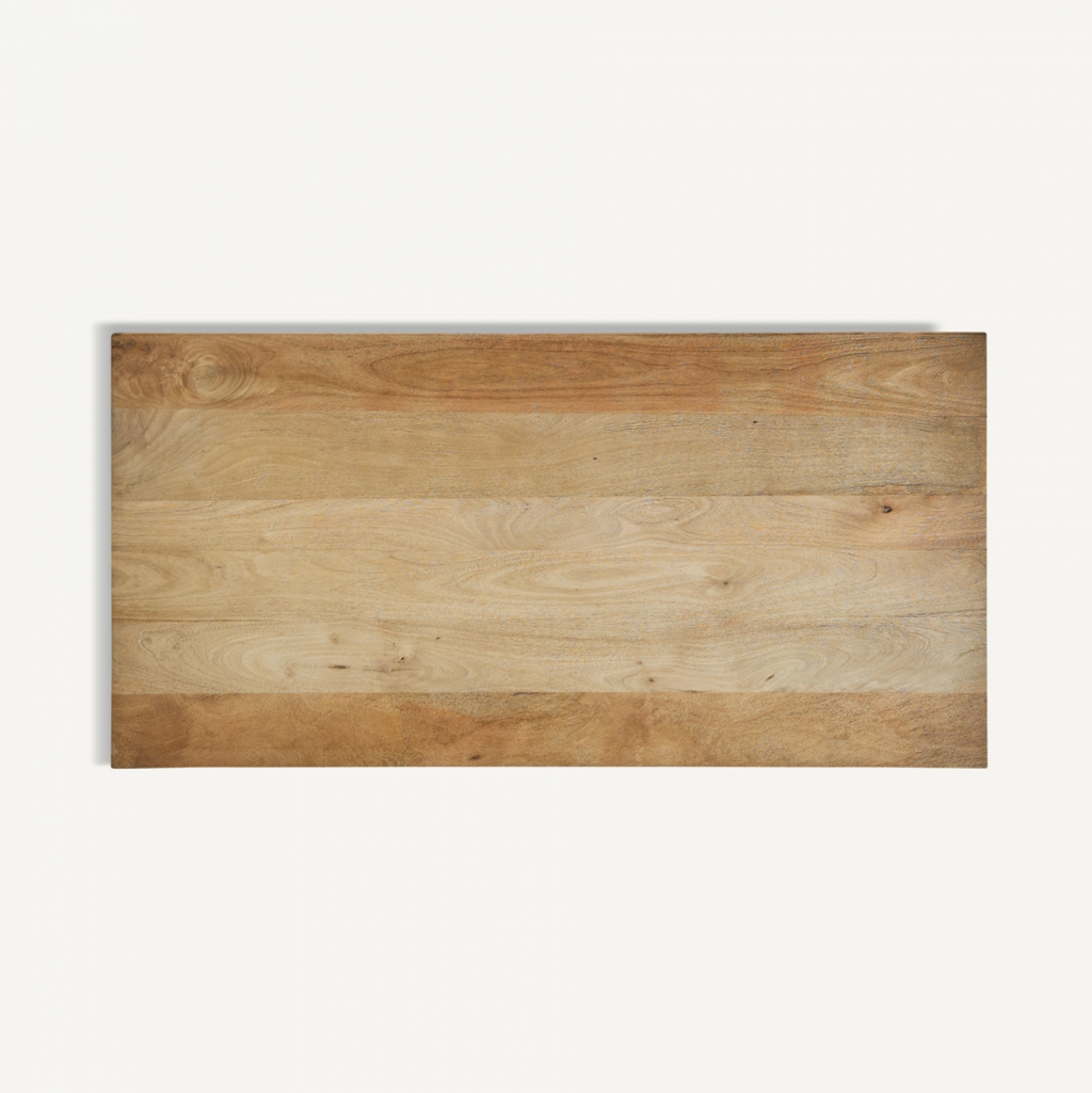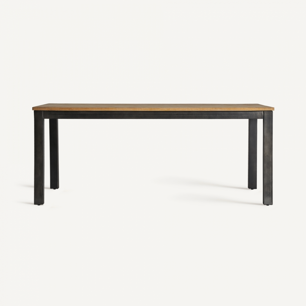 Mesa comedor Courry, en color marrón fabricado en madera de mango natural. Con dimensiones de 188x93x78cm, este mueble une la calidez de la madera de mango con la solidez del hierro, en una paleta de negro y natural que emana modernidad. Es la elección perfecta para comidas familiares o cenas formales.